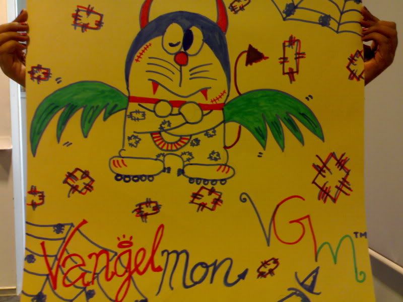 Today module was kinda fun. It's bout glowing in the dark. How to make roses glow in the dark. OH MY GOD so cool right?! how i wish i got a bouquet or glow in the dark roses. soso nice PLEASE! then we have to draw this Doraemon + vampire + Angel + Devil + Sonic + Criss Angel + Spiderman = Our very own VangelMon. [pic. below]